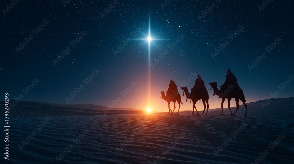 Three wise men on camels are walking through the desert at night. The Adoration of the Magi. #1795770293