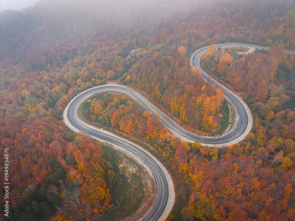 Top-down drone shot of the winding road winding through the autumn forest in Domanic, Kutahya #1949834870