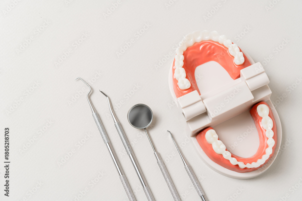 Top-view composition of dental jaw model with professional stainless-steel dental tools placed on clean light background. Ideal for illustrating dentistry, oral care, dental clinics, orthodontics. #1805218703