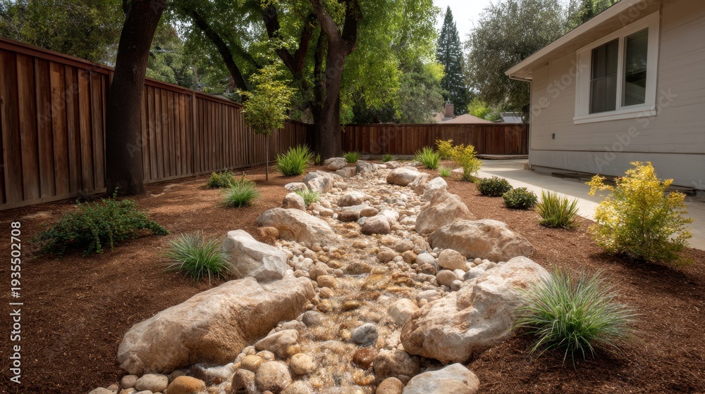 Tranquil garden landscape featuring decorative rock waterway and lush greenery under bright daylight in residential setting #1935502708