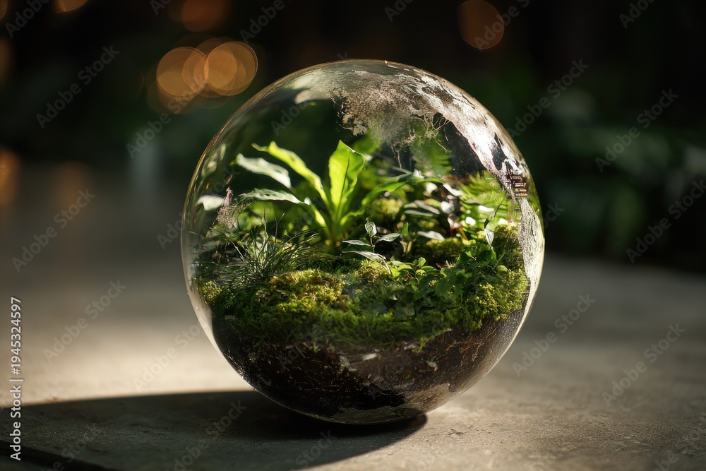 Transparent earth globe terrarium filled with jungle plants, global ecosystem concept #1945324597