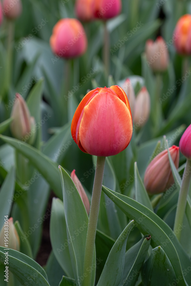 Tulips bloom in spring garden showcasing vibrant colors with green leaves surrounding the flowers #1956383054