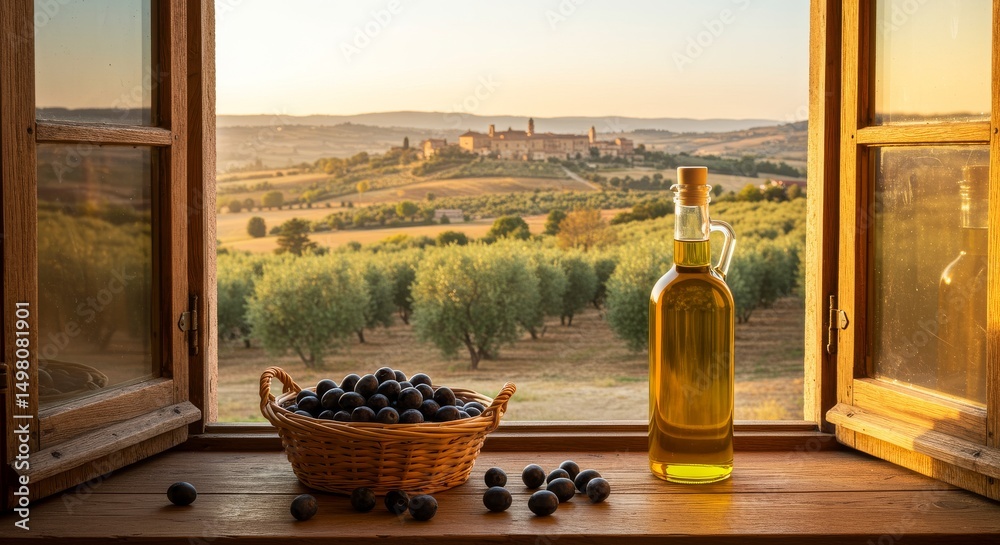 Tuscan Olive Harvest View - A rustic window scene showcasing a basket of olives, olive oil bottle, and a picturesque Tuscan landscape #1498081901
