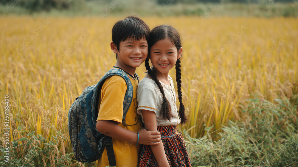two ethnic hmong children smiling and holding each other, one child is carrying the backpack on his back while standing in rice fields, t-shirt with sleeves and skirt from woven fabric, pigtails, gold #1757133400
