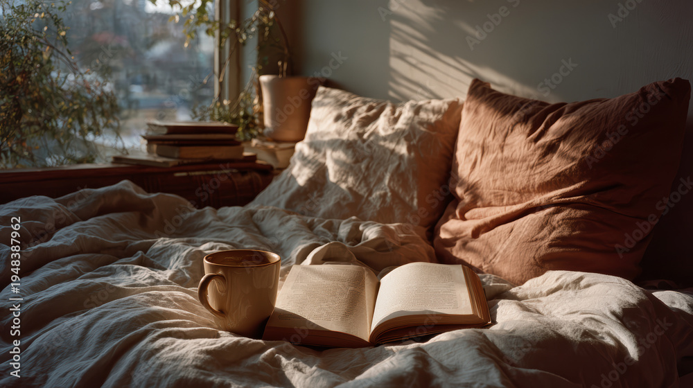 Unmade Bed Two Pillow Indentations Open Book Empty Coffee Cup Morning Light — Lifestyle Editorial Intimacy Domestic Living #1948387962