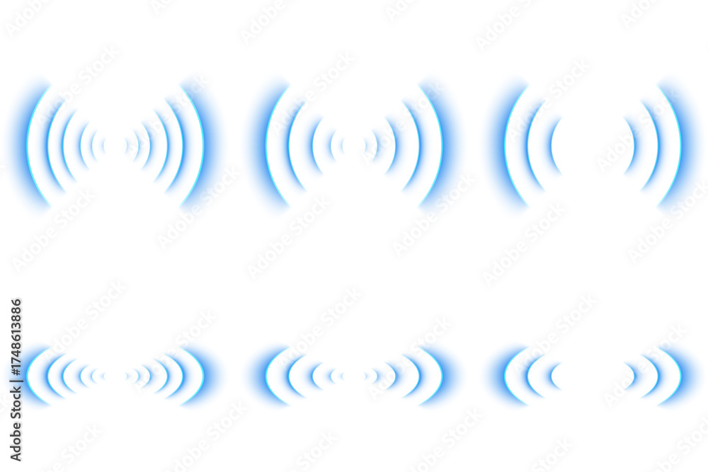 Vector blue sonar waves with circular radar rings and sound pulse patterns. Abstract concentric signal design showing audio vibration, echo reflection, and sound frequency for technology illustration. #1748613886