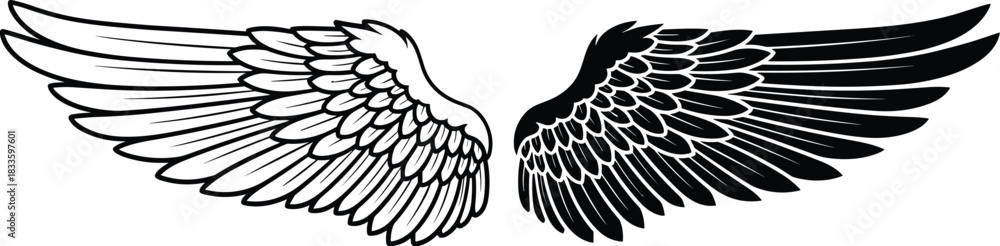 Vector illustration of a pair of decorative spread wings, one in black outline and one solid fill, symbolizing freedom, divinity, angel mythology, flight #1833597601