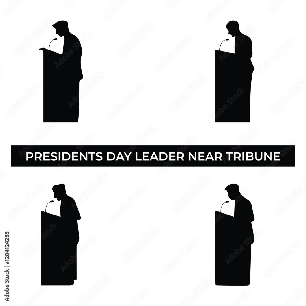 • #1204124285 Vector Illustration of Presidents' Day Leader Near Tribune. Simple Flat Design Depicting Patriotic Leadership, Public Speaking, and American History.