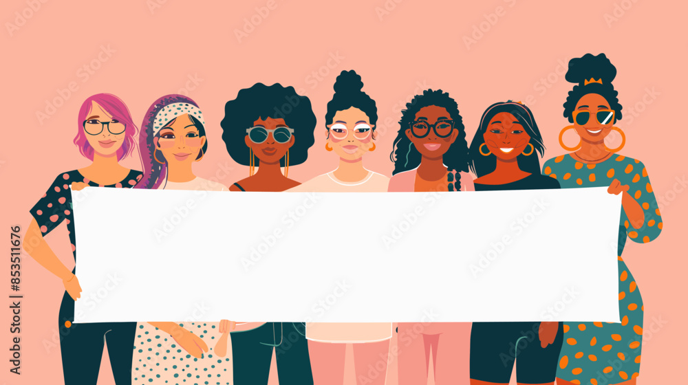 Vector of brave women of various ethnicities holding banner in support of female empowerment #853511676