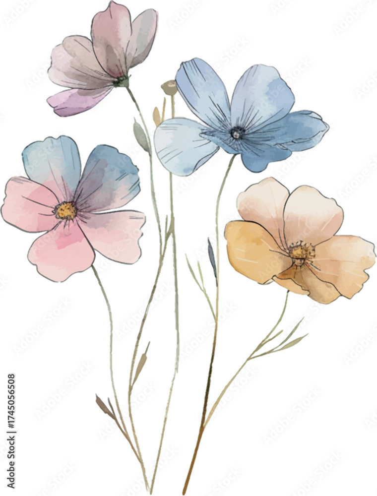 Vector watercolor illustration of delicate wildflowers in pastel colors #1745056508