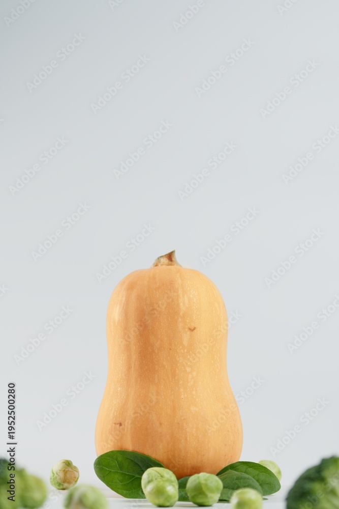 Vertical macro of butternut squash with brussels sprouts and spinach on gray background. Blurry broccoli in foreground. Fresh organic vegetables and harvest concept with copy space on top for text. #1952500280