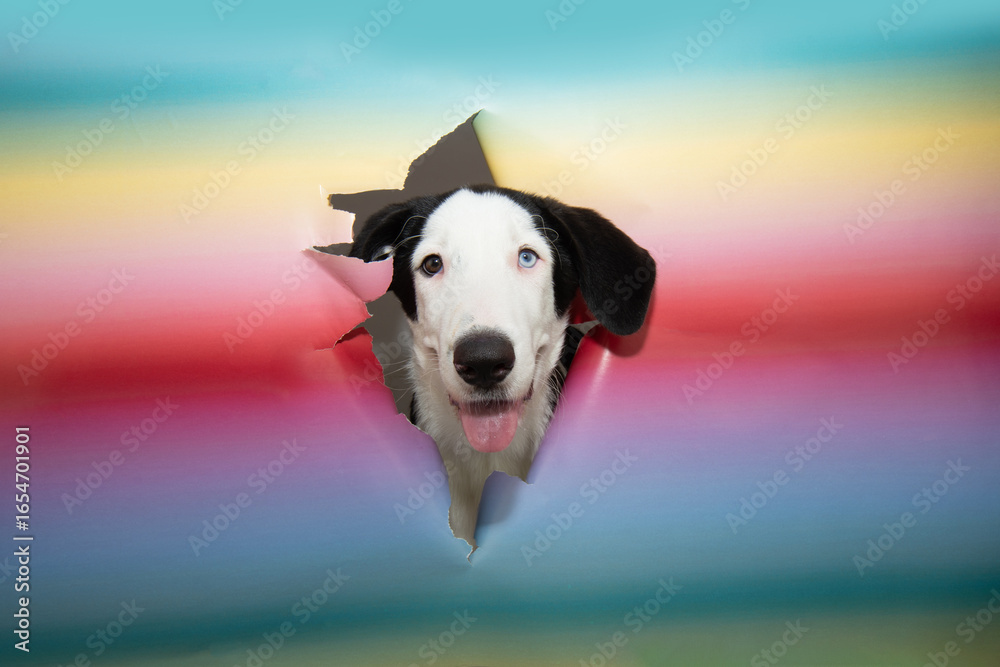 Vibrant colorful paper background torn to reveal curious puppy dog, frozen in a comical moment of surprise, radiating playful curiosity. #1654701901