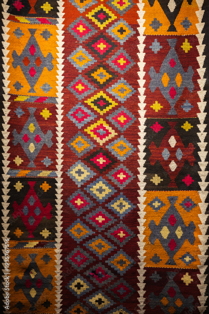 Vibrant kilim rug featuring repeating geometric and tribal motifs in warm reds, yellows and blues. Handwoven wool textile ideal for bohemian, ethnic or traditional interior decor and wall hanging #1935767516