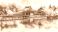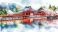 Vibrant watercolor depiction of a Japanese temple complex by a serene lake. #1443965251