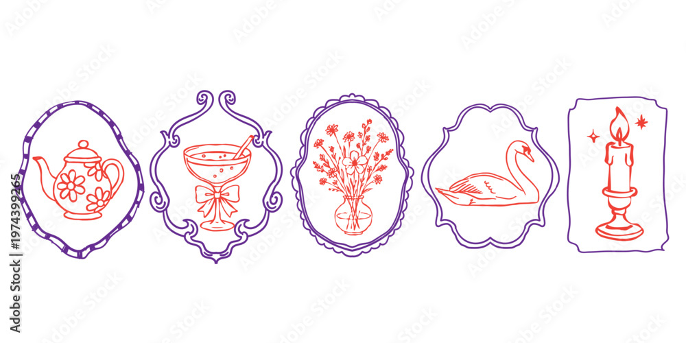 Vintage ornamental frame vector set, hand drawn line art elements floral teapot, cocktail glass with ribbon, flower vase, swan, and candle. design illustration doodle style #1974399265