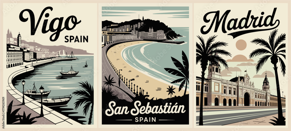 Vintage style vector travel poster set of Vigo, San Sebastián, and Madrid, featuring bold black silhouettes, muted blue tones, retro typography, and stylized coastal and architectural landmarks #1794263969