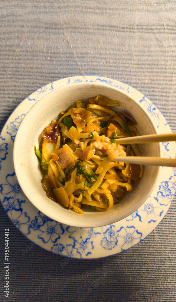 Warm Noodle Bowl With Vegetables and Chopsticks On Decorative Plate, Top down Food Photography #1950447412