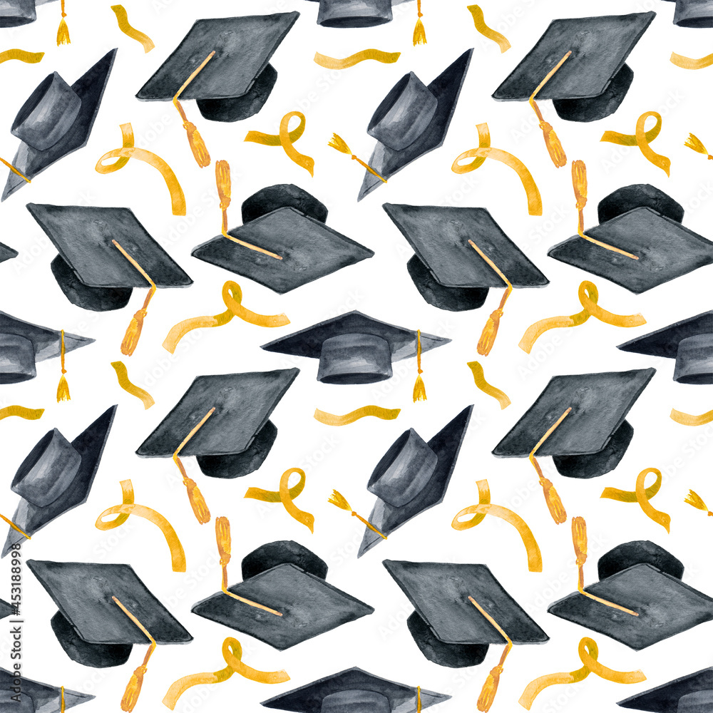 Watercolor illustration of Academic student graduation celebration uniform caps. University hat in black ink pattern with gold ribbons. #453188998