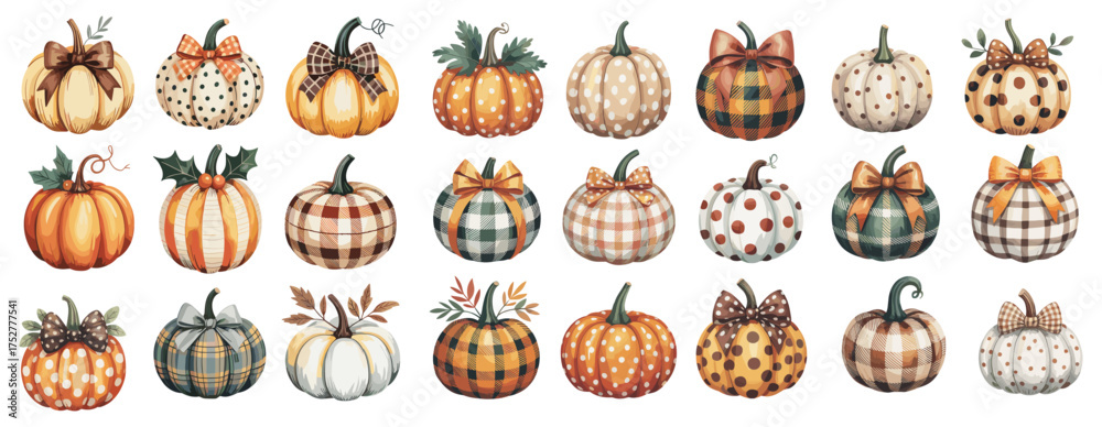 Watercolor illustration of decorative pumpkins in autumn colors with plaid, polka dot, and striped patterns, adorned with bows, isolated on transparent background #1752777541