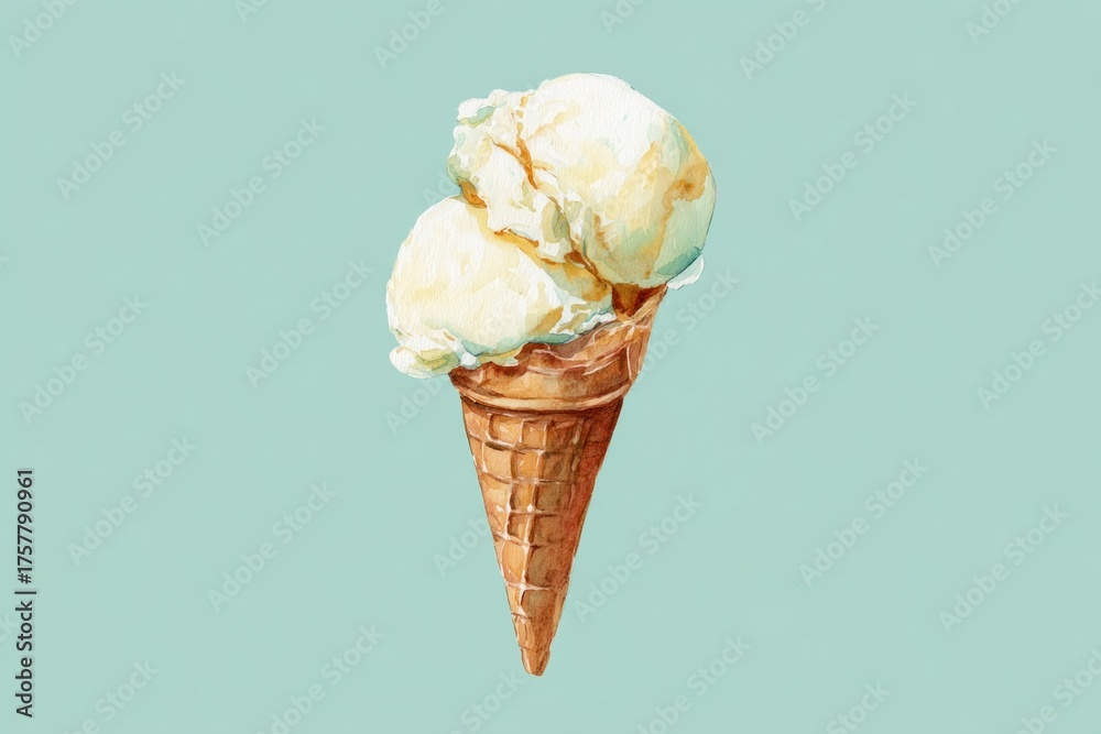 watercolor illustration of vanilla ice cream cone with two scoops, pastel mint background, minimal playful style #1757790961