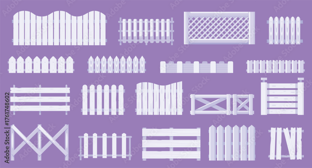White fence. Cartoon wooden garden picket gate, rustic country house decorative barrier, rural village exterior elements. Vector garden wood fence set #1761748602