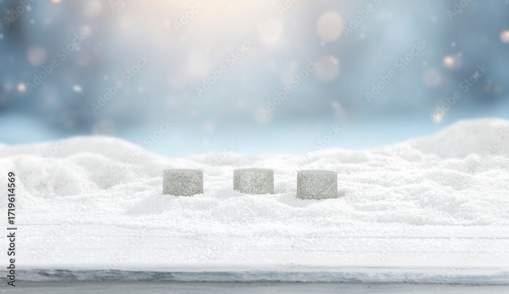 Winter landscape with fresh white snow and copy space for product placement or text. Blurred snow-covered trees and cloudy winter sky background. #1719614569