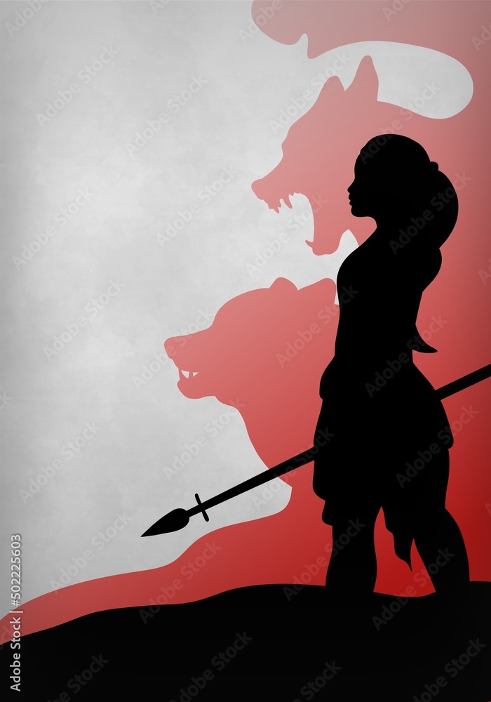Woman warrior and the wolves. Fantasy silhouette art #502225603