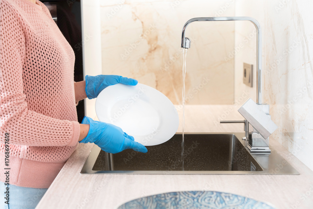 Woman washing dishes by hand in kitchen sink with running water - cleaning, hygiene, housework, domestic chores, daily routine, kitchen life. #1768697619