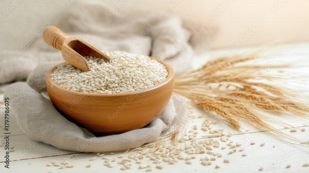Wooden Bowl Filled with Barley Grains on White Isolated Background. Generative AI #1797986075