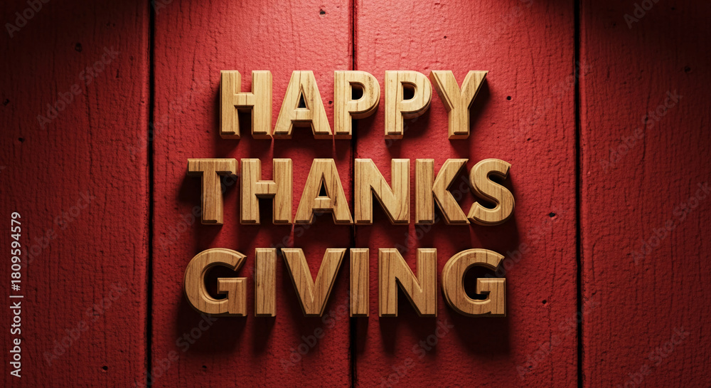 Wooden inscription Happy Thanksgiving on a textured red wall, showcasing holiday theme, representing celebration, tradition, and festive atmosphere #1809594579