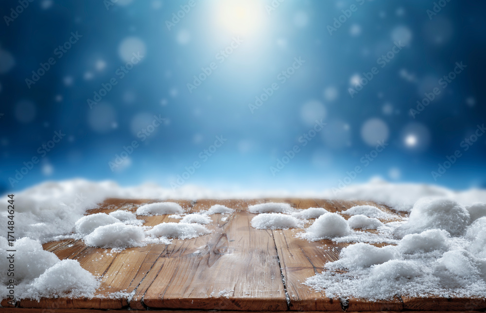 Wooden surface covered with snow with empty copy space for product placement with blurred dark blue frosty winter snowing background. Seasonal advertising, nature, winter concept. #1714846244