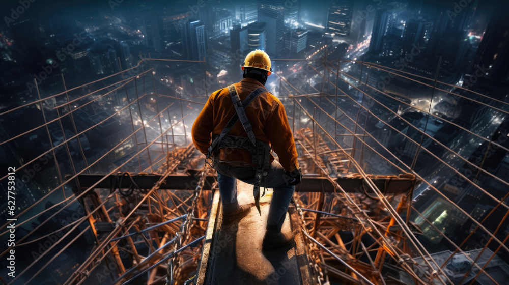 Worker installs equipment on a skyscraper at a high altitude. #627753812
