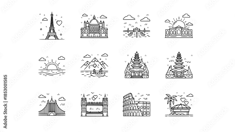 World landmarks illustrate sightseeing icons in tourism location icons or europe travel landmarks showcase sightseeing icons in vacations landscape #1853001585