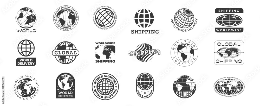 Worldwide shipping logo. World global delivery service badge with abstract planet map, international mail shipment icon flat linear style. Vector globe shipping icon set #1351731263