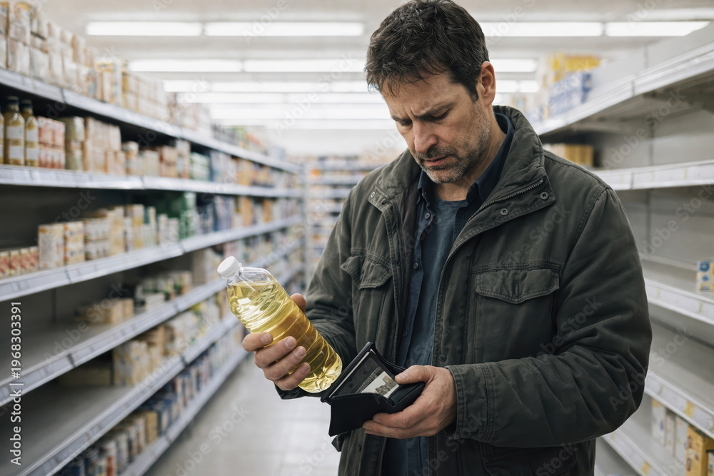 worried shopper holding cooking oil and wallet in supermarket with sparse shelves #1968303391