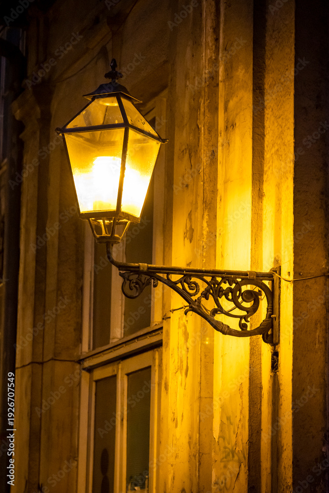 Yellow facade with a lit lantern, Zagreb, Croatia #1926707549