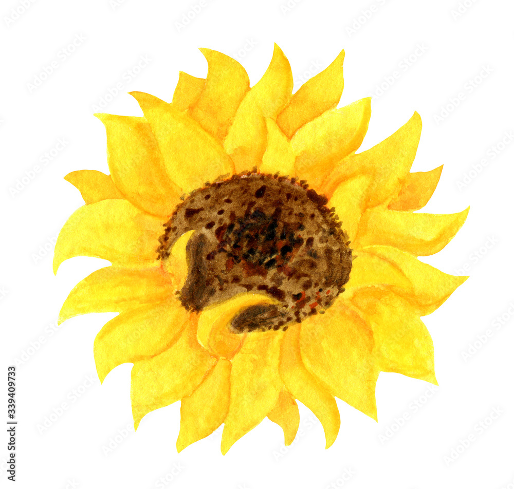 Yellow flower of a sunflower on a white background. Botanical watercolor illustration. #339409733