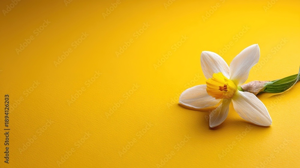 Yellow flower with white petals and yellow center sits on a solid yellow background in soft light #1894126203