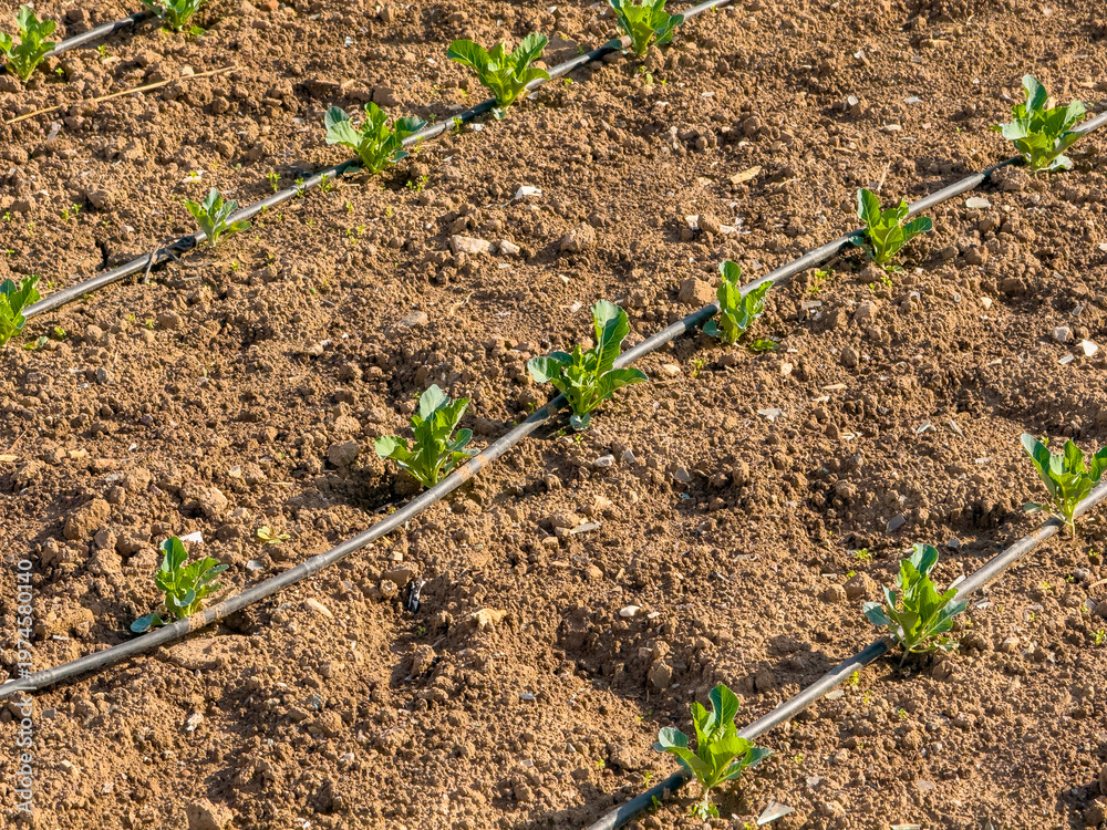 Young plants growing with drip irrigation system in dry soil agriculture #1974580140