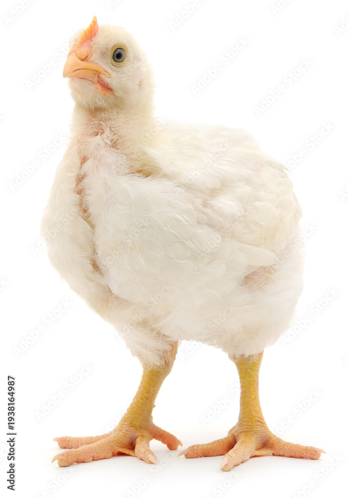 Young white broiler chicken standing isolated on white background looking away #1938164987