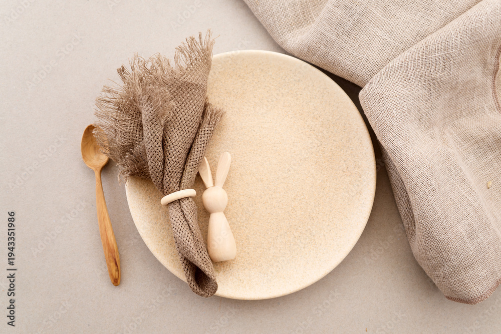 Zero waste Easter. Easter table setting with wooden bunny and linen napkin #1943351986