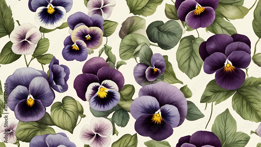 A beautifully illustrated seamless pattern of vibrant purple pansy flowers with green leaves, creating a delicate and elegant floral garden background #1801042628