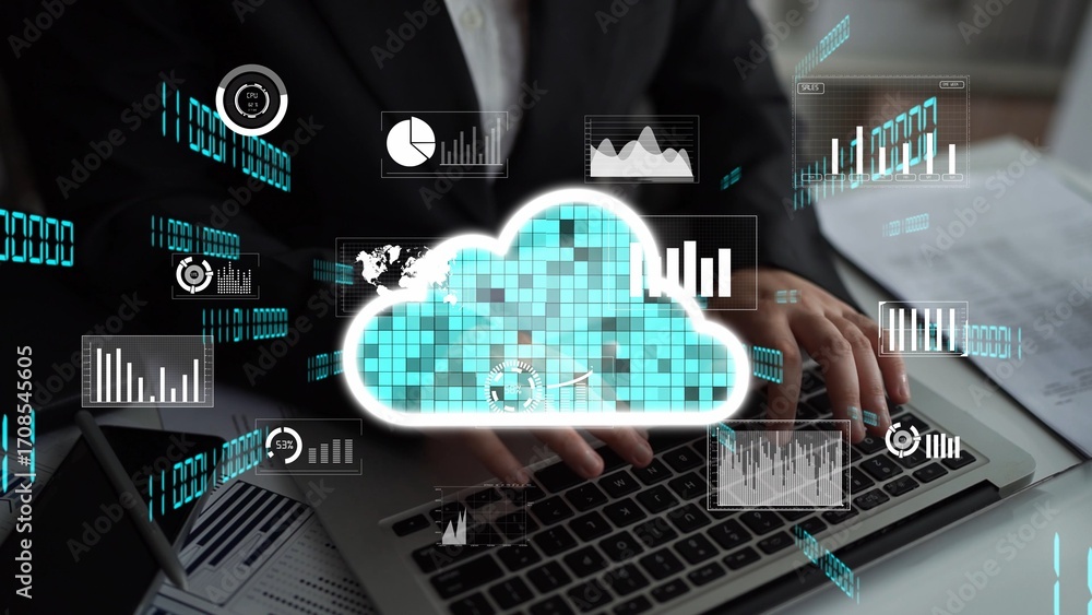 A blend of technology and data analysis showcases a user typing on a laptop with cloud graphics and digital data elements representing modern computing and analytics. Xenic #1708545605