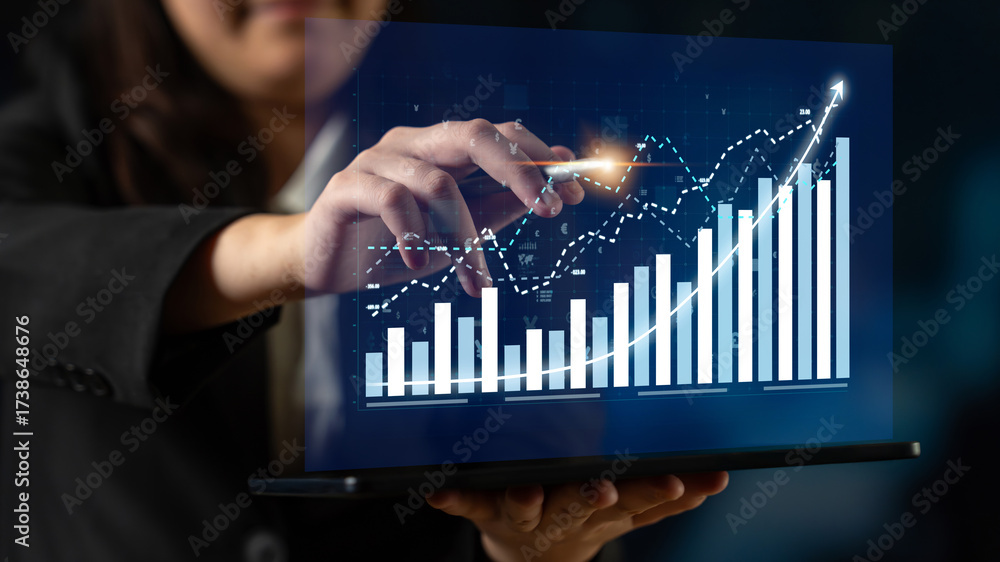 A business professional engages with a transparent digital screen displaying financial graphs and data trends, symbolizing market potential and analytical insight. Impute #1738648676