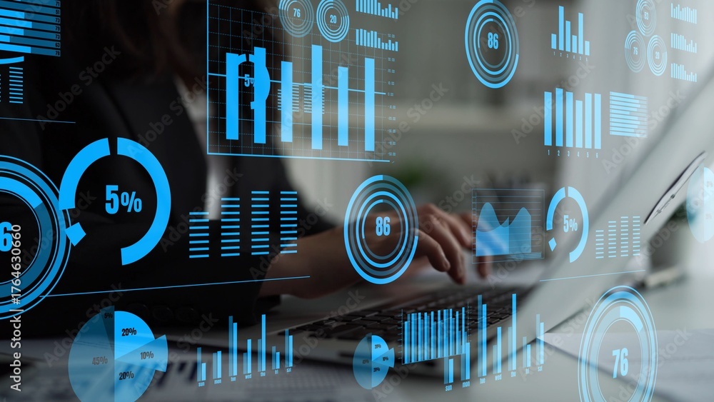 A business professional interacts with a laptop surrounded by futuristic data visuals, conducting in-depth analysis to drive strategic decisions in a modern workspace. Xenic #1764630660