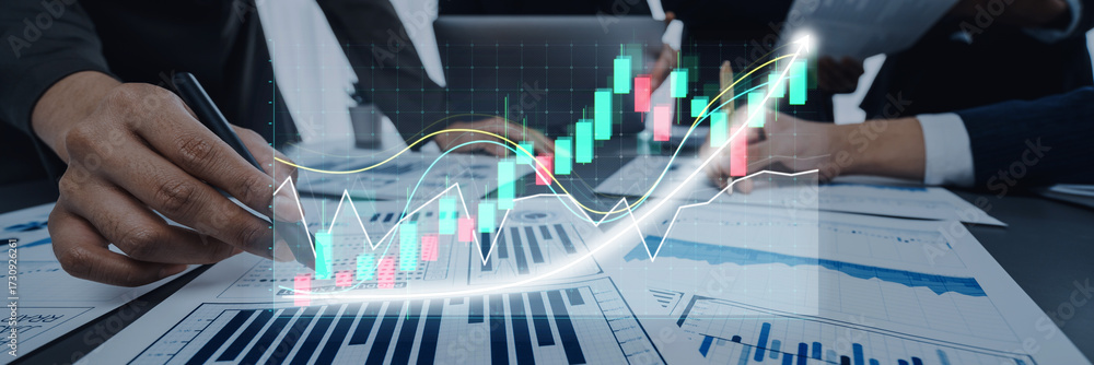 A business team collaborates on financial analysis, reviewing charts and graphs to identify trends and make informed investment decisions for future growth. Axiom #1730926261