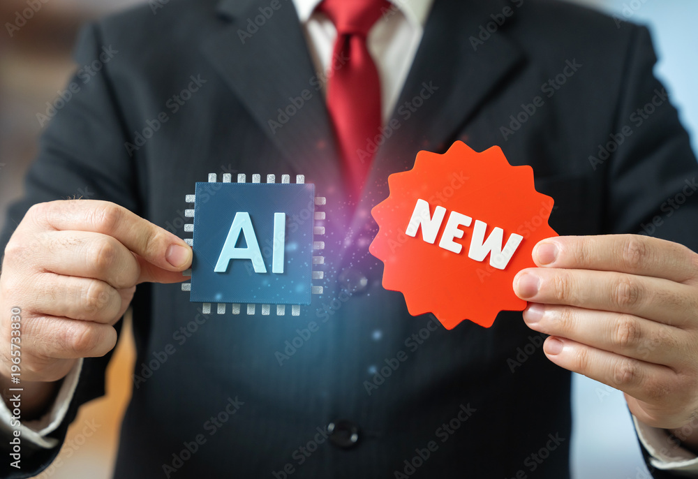 A businessman presents a new AI tool showing improved technology. Artificial intelligence innovation boosts efficiency. Business automation, solutions, and digital transformation enhance productivity #1965733830