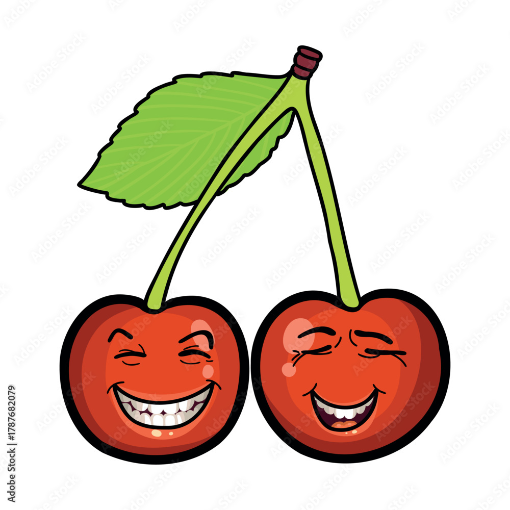 A cheerful cherry laughing. Cherry with a laughing face on a white background, cartoon flat style. Two cheerful mascot characters. #1787682079