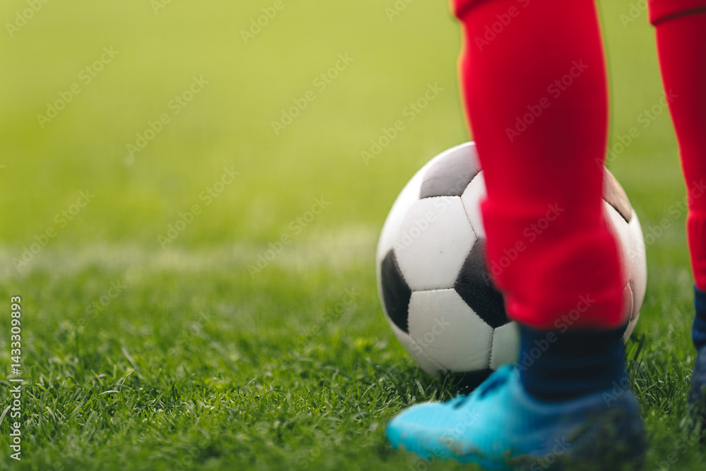 A close-up of a young soccer player in red socks and blue cleats standing next to a black and white soccer ball on a green grassy field #1433309893