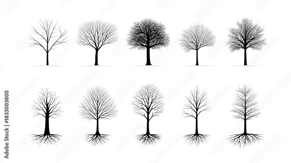 A collection of ten diverse graphic illust ns of bare deciduous trees during winter each featuring prominent root systems and isolated on a white background #1833003800